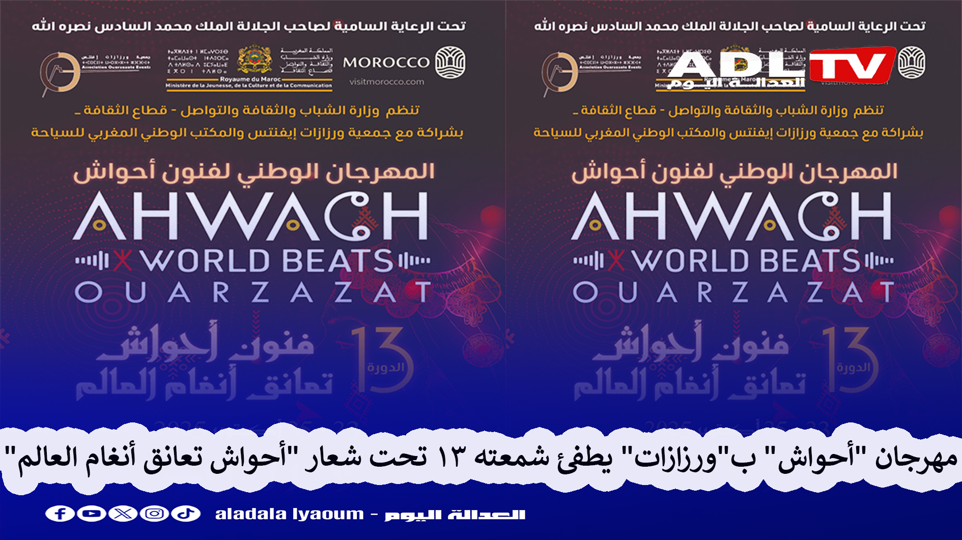 تحت الرعاية السامية لصاحب الجلالة الملك “محمد السادس”، نصره الله وأيده. تنظم وزارة الشباب والثقافة والتواصل، قطاع الثقافة. بشراكة مع “جمعية ورزازات إيفنتس” وبدعم من عمالة إقليم ورزازات والمكتب الوطني المغربي للسياحة. إضافة ل”مجلس جهة درعة تافيلالت”، المجلس الإقليمي لورزازات و”الجماعة الترابية لورزازات”. فضلا عن المجلس الإقليمي للسياحة ب”ورزازات” ومتحف السينما بورزازات. الدوة الثالثة عشرة “للمهرجان الوطني لفنون أحواش”، المنظم هاته السنة تحت شعار: “فنون أحواش تعانق أنغام العالم”. وذلك أيام 23، 24 و25 أكتوبر 2025 ب”مدينة ورزازات”.