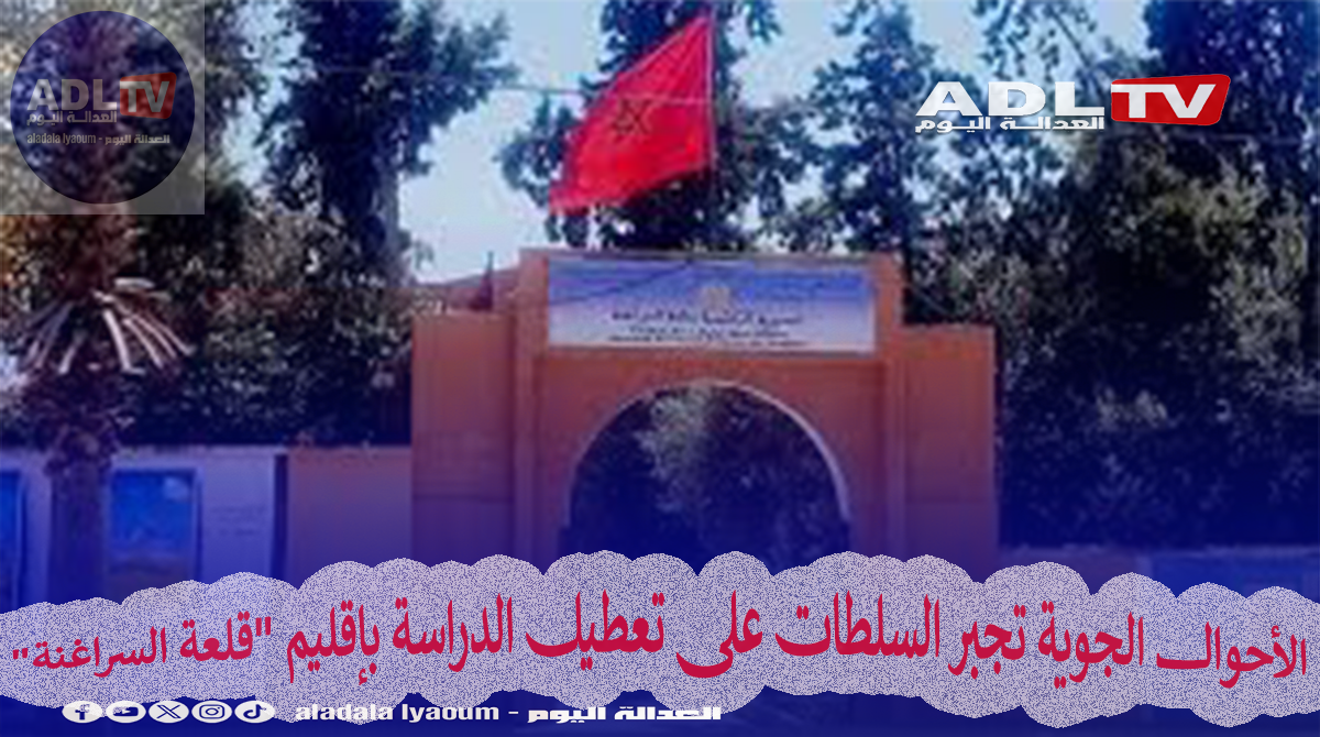 استنادا لمبادئ الاستباقية في تدبير المخاطر وتفاعلا مع النشرة الإنذارية التي أصدرتها “مديرية الأرصاد الجوية الوطنية”، يوم الجمعة 26 دجنبر 2025. قررت “المديرية الإقليمية لوزارة التربية الوطنية والتعليم الأولي والرياضة” ب”قلعة السراغنة” تعطيل الدراسة بصفة استثنائية وشاملة في جميع المؤسسات التعليمية العمومية والخصوصية التابعة للإقليم. وذلك اليوم السبت 27 دجنبر.